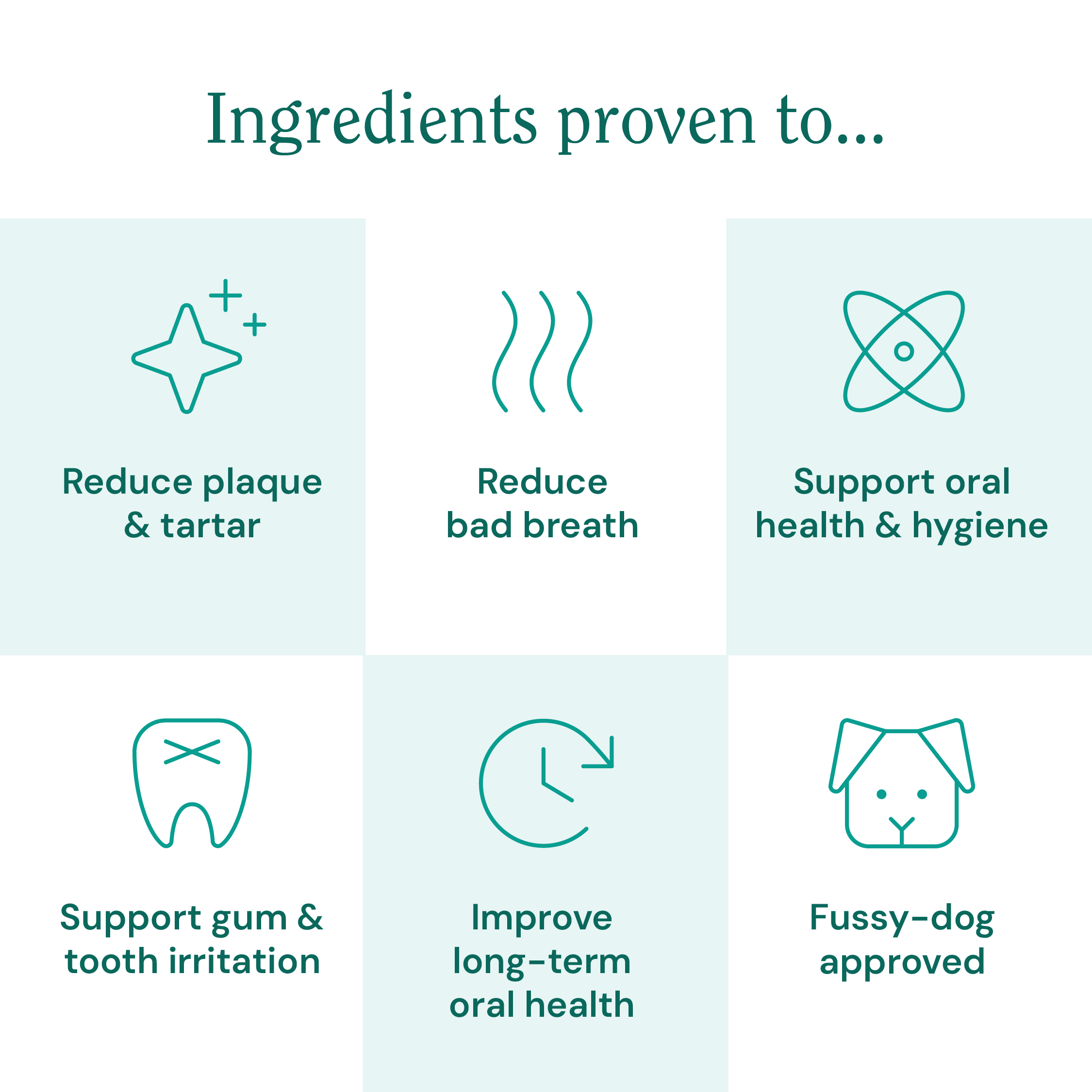 Give your dog the comprehensive dental care they deserve with our science-backed blend of ingredients. Specially formulated to help reduce and prevent plaque and tartar build-up, soothe sensitive gums, and support a balanced oral environment, it’s designed to keep your dog’s healthy and comfortable.