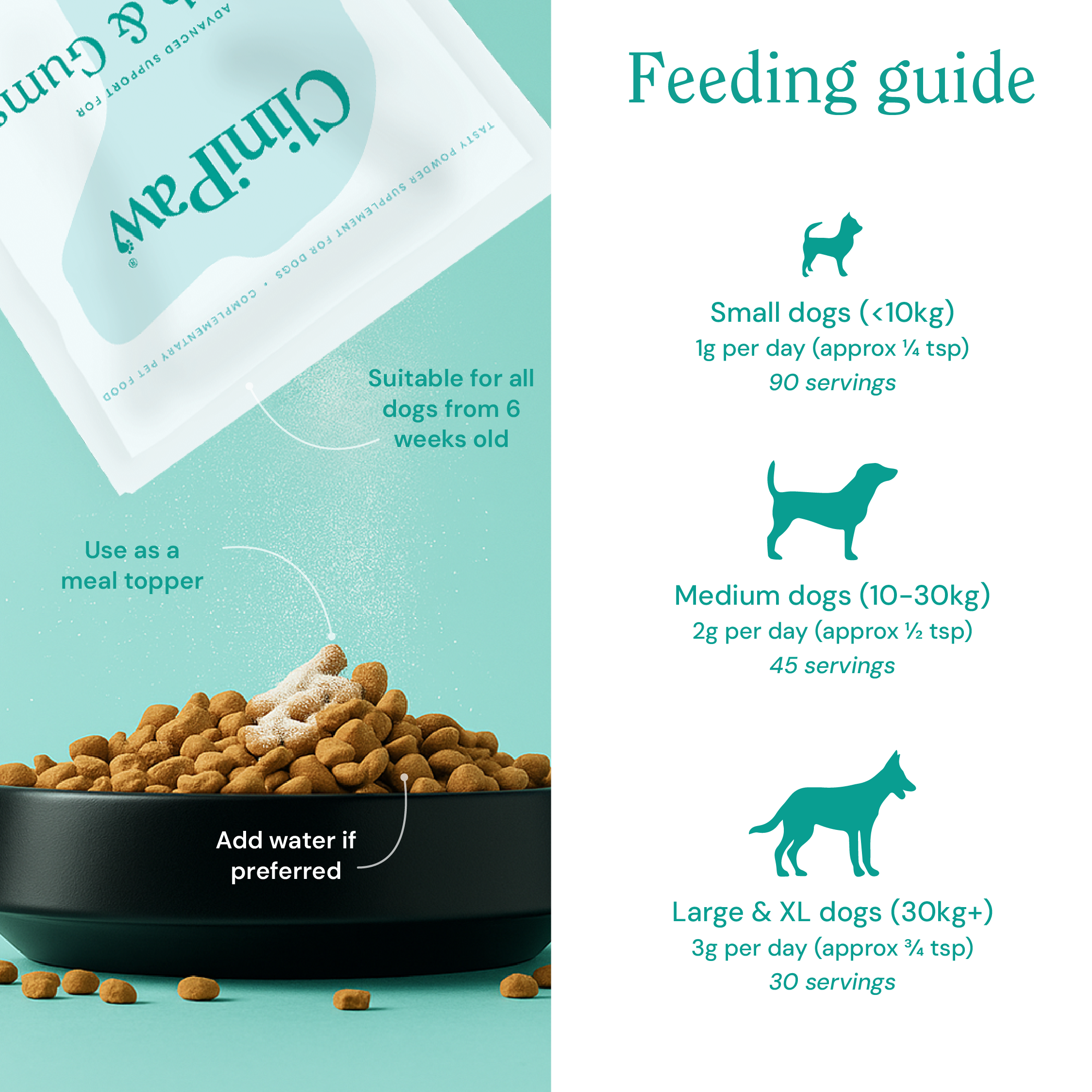 Large & XL dogs (30kg+) 3g per day (approx ¾ tsp)