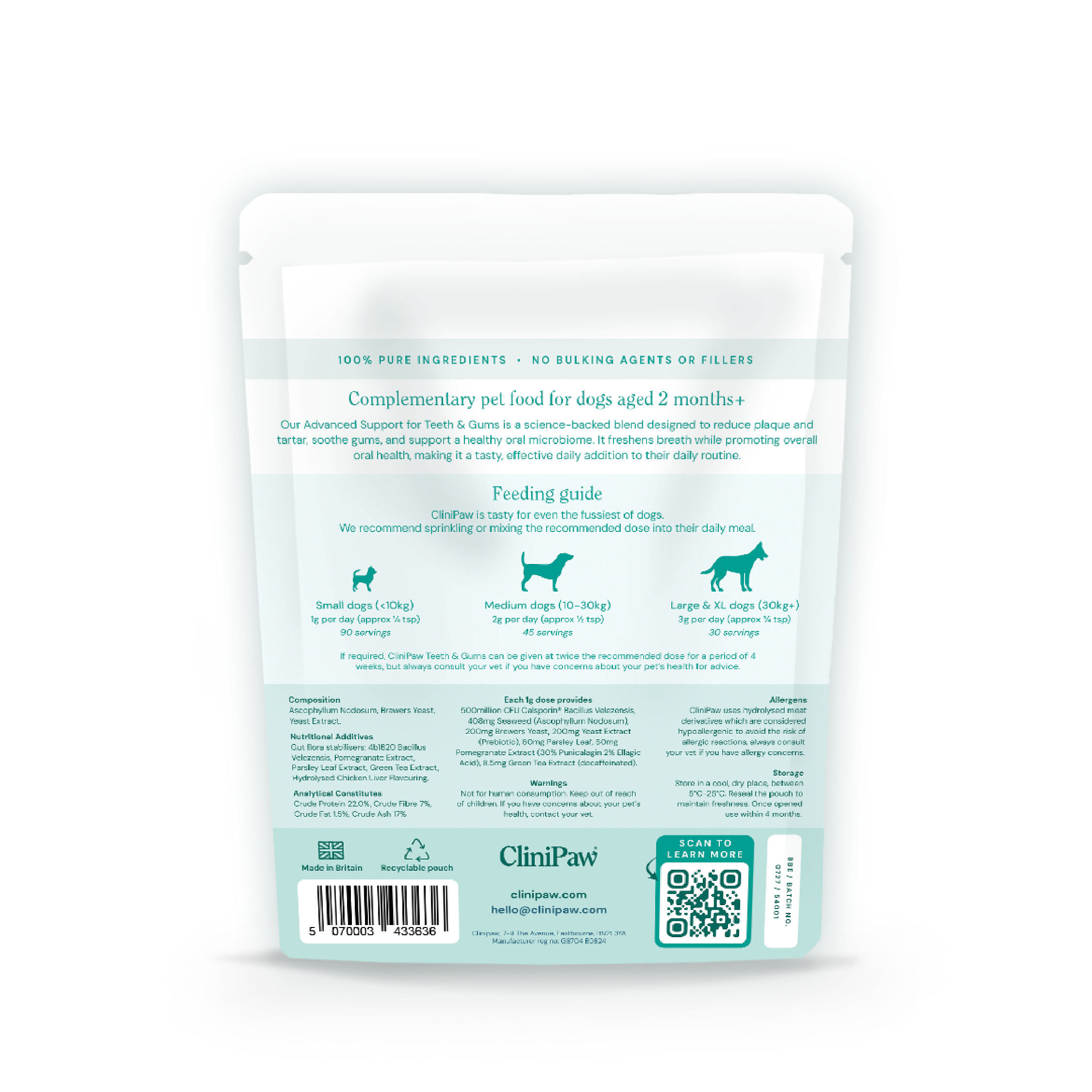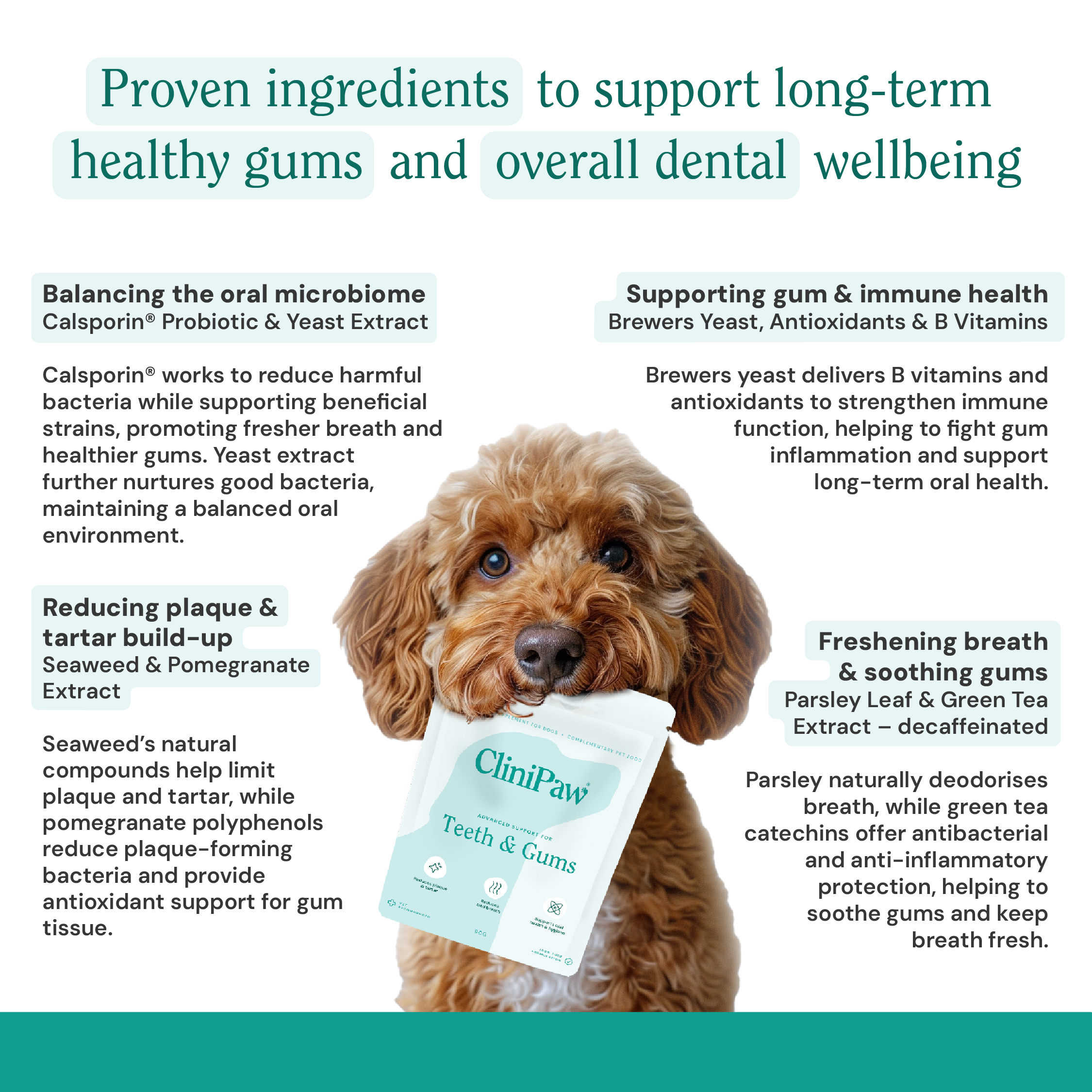 With CliniPaw Advanced Support for Teeth & Gums, many dogs start to show fresher breath within 2–3 weeks as oral bacteria are brought into balance. After 6–8 weeks of consistent use, you should notice more visible improvements, such as reduced plaque and tartar buildup, healthier gums, and long-lasting freshness. For the best results, make CliniPaw Advanced Support a daily part of your dog’s routine to protect teeth and gums for the long term.